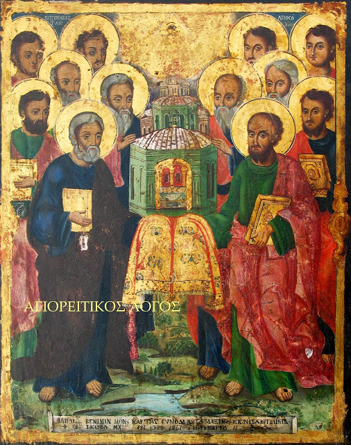 Ἡ πάνσεπτος τῶν Ἀποστόλων, ἐπεδήμησεν ἑορτή, τῇ Ἐκκλησίᾳ Χριστοῦ, προξενοῦσα σωτηρίαν ἡμῖν, μυστικῶς οὖν κροτήσαντες, τούτοις προσείπωμεν· Χαίρετε φωστῆρες τῶν ἐν σκότει, τοῦ ἡλίου ἀκτῖνες ὑπάρχοντες· Χαίρετε Πέτρε καὶ Παῦλε, δογμάτων τῶν θείων θεμέλιοι ἀρραγεῖς, φίλοι τοῦ Χριστοῦ, σκεύη τίμια. Πάρεστε μέσον ἡμῶν ἀοράτως, καταξιοῦντες δωρεῶν ἀΰλων, τοὺς τὴν ὑμῶν ἑορτήν, εὐφημοῦντας ᾄσμασι.
